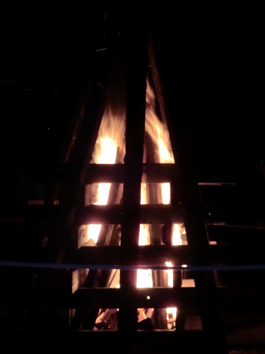 暗くなってきたので、後ろのキャンプファイヤーに火を点けたいと思います!!」