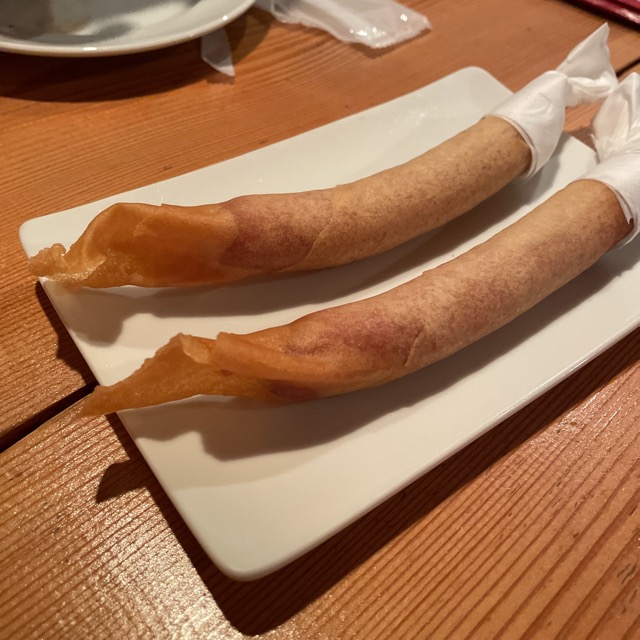 チョリソーを春巻の皮で包んで揚げたやつ。