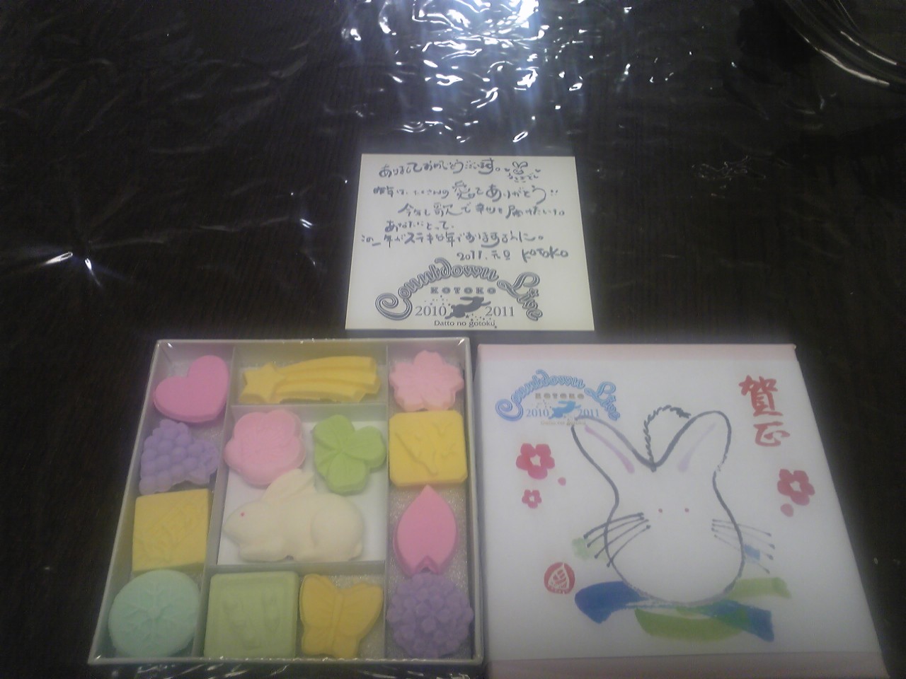 雷鳴が鳴く頃 ライブで初聴き3。 これはぜひとも聴きたかった曲です。 サビの高音のところがたまりません(*´▽`) この曲、癒しの曲だとWebラジオでは言われていましたが、 自分的にはもっと悲しい曲のイメージでした。 「そうか私、ずっと疲れていたのかな…。」の部分がいつも心に染みます。 ふと気付く瞬間って、あるんですよね。 最近は専らKOTOKOソングを聴きながら気付くことが多い気がします。 snow angel ライブで初聴き4。 これもぜひとも聴きたかった! 『冬の雫が連れてきた』のライブDVDでしか聴いたことがなかったので。 「曇りガラスに書いた 永遠を綴った文字が 涙を流すの 二人で見ていた」 のところがとても印象的です。 冬の雫 ライブで初聴き5。 冬の曲、三つとも来ましたね! (これら以外にもあるのかな?) これも聴きたかったので嬉しかったです! サビのピアノをダララララッってやるところが好きなのですが、 ライブではさすがに無理だったかー(^^;) I pray to stop my cry ライブで初聴き6。 最近聴いてなかったので油断していました。 まさかこれが来るとは!! Belvedia 2009年の武道館以来ですね。 その時は知らなかったので「?」状態でしたが、 今回はバッチリでした! RI←SU→KU 2009年のspecial stage以来! 「Stop! pretext」の振り、つい一緒になってやってしまいました。 横幅がないのでだいぶ遠慮しながら、でしたけど(笑)。 いやーこの曲も盛り上がりますよねー。 We survive ライブで初聴き7。 これも最近聴いてなかったので、途中まで「何の曲だっけ?」って しばらく思い出せませんでした(^^;) 友達の一人が一番好き!って言ってた曲でした。 まぁ、その友達は今回来れなかったので残念だったわけですが。 resolution of soul 2010年の武道館以来! これも今回来ましたかー。 またカラオケUGAに行きたくなりました(笑)。 リアル鬼ごっこ おぉ、若干久しぶり?なこの曲。 サビの高音部分は聴く度に「凄いなー!」と聴き入ってしまいます。 Asura ライブで初聴き8。 ライブで聴くとかっこよさが増しますね! PIGEON -the green-ey'd monster- ライブで初聴き9。 これはずっと聴きたかった! 待ち望んでおりました! きっとたけるん(正式名:たけるくん)も叫んでたんじゃないかな(笑)。 KOTOKOさん、色っぽいー(*´▽`) Sledgehammer Romance ライブで初聴き10。 人気高い曲らしいですが、意外にもライブ初披露なんですよね。 Loop-the-Loop 2010年夏のツアーで宿題を出されたこの曲。 来ないわけがありませんよね! さて、間奏に入り、一旦KOTOKOさんがMCモードに入られます。 そしてステージのスクリーンには現在時刻が大きく表示されました。 なんともう23:58。 というわけで、10秒前から皆で一斉にカウントダウンを始めます。 カウントダウンが初め若干ずれていたのはご愛嬌♪ 「「「3!」」」 「「「2!!」」」 「「「1!!!」」」 「「「あけましておめでとうーーーー!!!!!」」」 パン!という銀色リボンの噴射と共に、2011年が幕を開けました! カウントダウンライブで最も盛り上がる瞬間ですね!!(≧▽≦) そして途中だった『Loop-the-Loop』が最後まで演奏され、次の曲に。 Crystal moment ライブで初聴き11。 今回のライブで唯一知らない曲でした。 曲名だけは聞いたことあるのですが。 ε~Epsilon~ ラストでこの曲が来るとは超意外でした。 武道館以来。スペーシーな一曲です。 ~アンコール~ ステージのライトが点灯し、メンバーさん達が再登場してきました。 おーと思っていると、なんとKOTOKOさんが大きなウサ耳付けてる! 萌え~(*´▽`) そして後ろに続く、ドラムの八木さんもこっそり付けてはる! も、萌え~(;´▽`) ※八木さんは結構大柄な男性の方です。 お正月らしく!ということで、ここで鏡開きが行われました。 「ライブが終わってから堪能してください」とのこと。 おぉ、後で戴けるそうな! それは楽しみだ! 樽酒って、ほんのり樽の木の香りがして、 普通の日本酒とはまた違う味わいがあって美味しいんですよね~♪ その後、更にお正月らしく!ということで、 "餅撒き" ならぬ "サイン撒き" が行われました。 サインの書かれたボールや飛行機、フリスビーなどが KOTOKOさんやバンドメンバーさんによって客席に撒かれます。 こういうのって後ろの方に飛ばされるもので、前にはなかなか来ないんですよね(;_ _) 力の限界もあるので、一番後ろまでは届いていなかったと思うし…。 それを考えると、前の席はライブをよく観ることができるので、 それだけでありがたくヨシとしなければ。 しかし途中、キーボード&マニピュレーターのフルフルこと古島さんが 私を見て、私に向けてサイングッズを投げてくれました! …いえ、そのように見えただけの勝手な妄想で、 結局そのグッズも前の席の男性方が取られたのですが(^^;) いいじゃん! 妄想は自由だもんね!(>_<) そんなこんなでサイン撒きも終了。 アンコールということで、曲に戻ります。 なんと次でラストとか( ノд`) being これも2010年武道館以来! まさかの、アンコール1曲(^^;) 正直ちょっと物足りない感はありましたが、